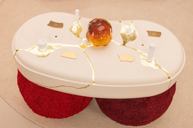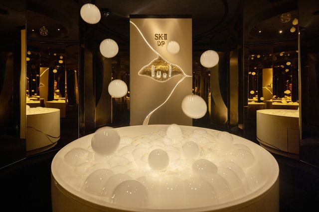 The LXP Experience is a gold-hued sanctuary with eight symbolic drops falling into a basin shaped like the LXP cream, representing 8x concentration of PITERA.